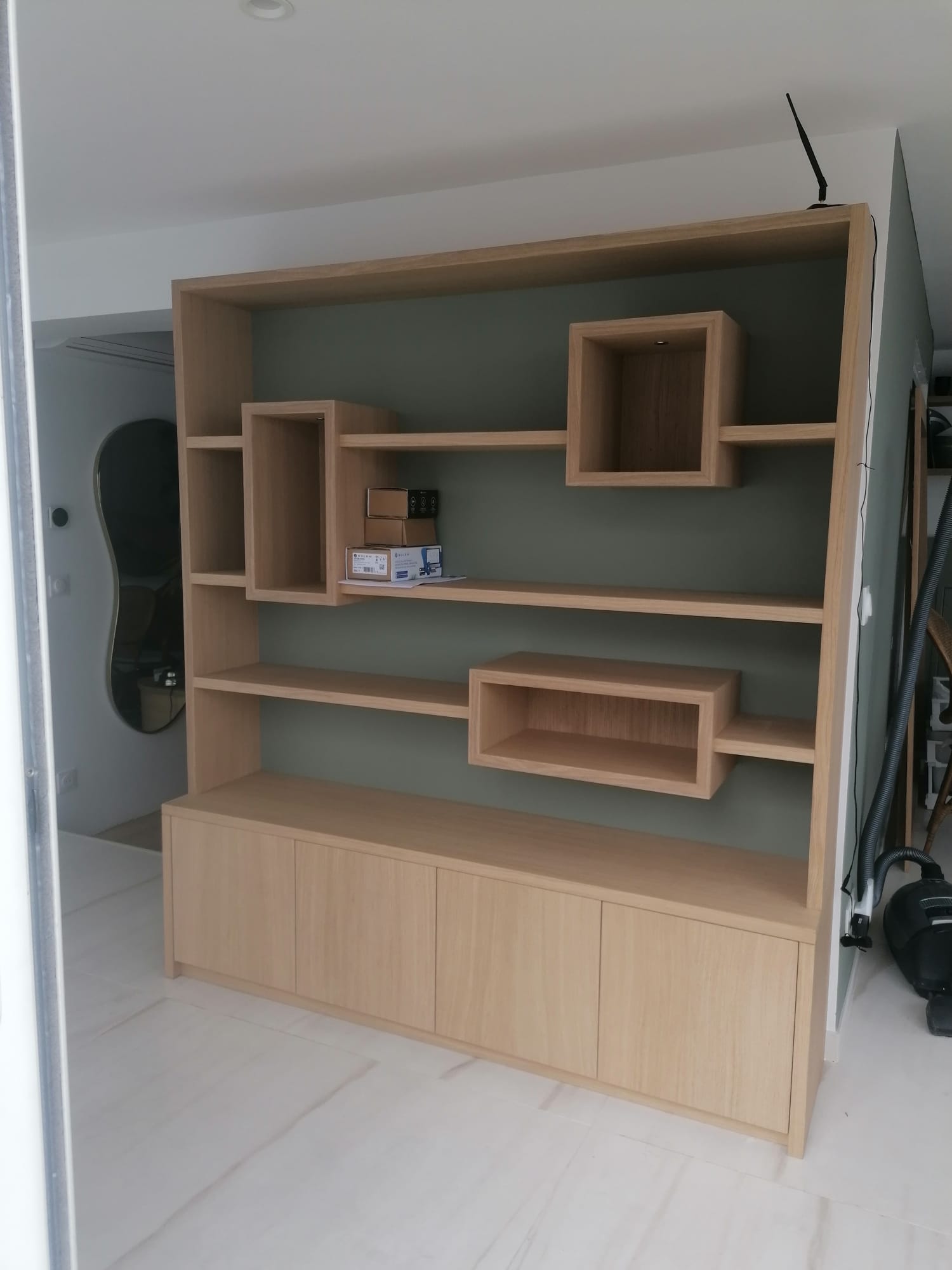 Custom-built melamine storage unit combining solid doors with open shelving, designed to support a smooth and well-organised daily routine. A solution that is both highly functional and visually refined ideal for bringing structure and rhythm to any room while serving multiple purposes.